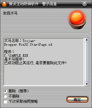 如果您已经将微点主动防御软件升级到最新版本,微点将报警提示您发现木马"Trojan-Dropper.Win32.StartPage.sd ”,请直接选择删除(如图2)。