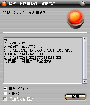 已安装使用微点主动防御软件的用户,无须任何设置,微点主动防御将自动保护您的系统免受该病毒的入侵和破坏。无论您是否已经升级到最新版本,微点主动防御都能够有效清除该病毒。如果您没有将微点主动防御软件升级到最新版,微点主动防御软件在发现该病毒后将报警提示您发现“未知木马”,请直接选择删除处理(如图1)