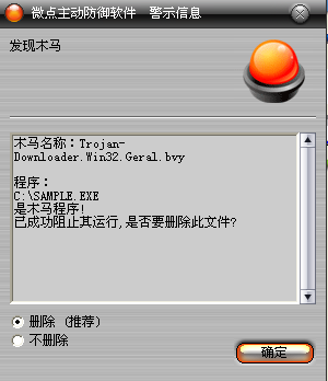 如果您已经将微点主动防御软件升级到最新版本,微点将报警提示您发现木马"Trojan-Downloader.Win32.Geral.bvy”,请直接选择删除(如图2)。