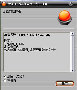 如果您已经将微点主动防御软件升级到最新版本,微点将报警提示您发现木马"Worm.Win32.Small.afm”,请直接选择删除(如图2)。