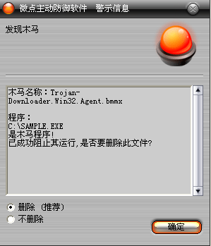 如果您已经将微点主动防御软件升级到最新版本,微点将报警提示您发现木马"Trojan-Downloader.Win32.Agent.bmmx”,请直接选择删除(如图2)。