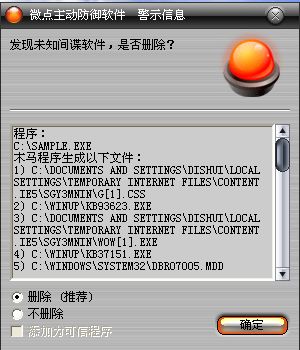 已安装使用微点主动防御软件的用户,无须任何设置,微点主动防御将自动保护您的系统免受该病毒的入侵和破坏。无论您是否已经升级到最新版本,微点主动防御都能够有效清除该病毒。如果您没有将微点主动防御软件升级到最新版,微点主动防御软件在发现该病毒后将报警提示您发现“未知间谍”,请直接选择删除处理(如图1)