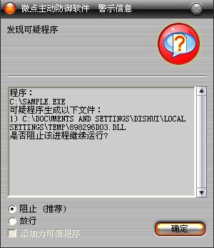 已安装使用微点主动防御软件的用户,无须任何设置,微点主动防御将自动保护您的系统免受该病毒的入侵和破坏。无论您是否已经升级到最新版本,微点主动防御都能够有效清除该病毒。如果您没有将微点主动防御软件升级到最新版,微点主动防御软件在发现该病毒后将报警提示您发现“可疑程序”,请直接选择删除处理(如图1)