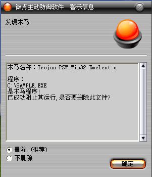 如果您已经将微点主动防御软件升级到最新版本,微点将报警提示您发现木马"Trojan-PSW.Win32.Emelent.u”,请直接选择删除(如图2)。