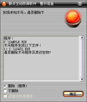 已安装使用微点主动防御软件的用户,无须任何设置,微点主动防御将自动保护您的系统免受该病毒的入侵和破坏。无论您是否已经升级到最新版本,微点主动防御都能够有效清除该病毒。如果您没有将微点主动防御软件升级到最新版,微点主动防御软件在发现该病毒后将报警提示您发现“未知木马”,请直接选择删除处理(如图1)