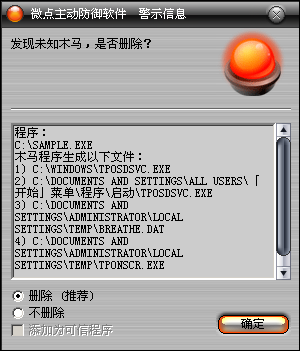 已安装使用微点主动防御软件的用户,无须任何设置,微点主动防御将自动保护您的系统免受该病毒的入侵和破坏。无论您是否已经升级到最新版本,微点主动防御都能够有效清除该病毒。如果您没有将微点主动防御软件升级到最新版,微点主动防御软件在发现该病毒后将报警提示您发现“未知木马”,请直接选择删除处理(如图1)