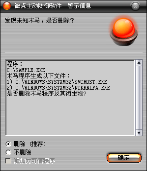 已安装使用微点主动防御软件的用户,无须任何设置,微点主动防御将自动保护您的系统免受该病毒的入侵和破坏。无论您是否已经升级到最新版本,微点主动防御都能够有效清除该病毒。如果您没有将微点主动防御软件升级到最新版,微点主动防御软件在发现该病毒后将报警提示您发现“未知木马”,请直接选择删除处理(如图1)