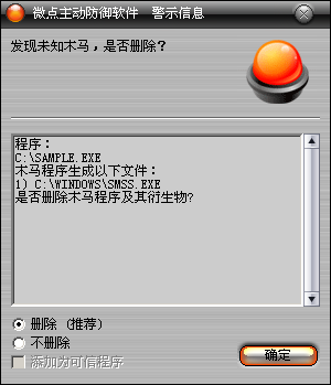 已安装使用微点主动防御软件的用户,无须任何设置,微点主动防御将自动保护您的系统免受该病毒的入侵和破坏。无论您是否已经升级到最新版本,微点主动防御都能够有效清除该病毒。如果您没有将微点主动防御软件升级到最新版,微点主动防御软件在发现该病毒后将报警提示您发现“未知木马”,请直接选择删除处理(如图1)