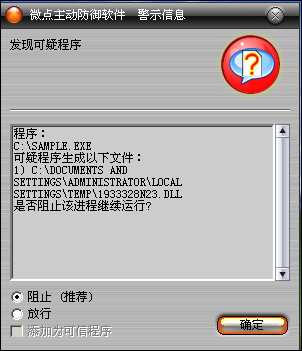 已安装使用微点主动防御软件的用户,无须任何设置,微点主动防御将自动保护您的系统免受该病毒的入侵和破坏。无论您是否已经升级到最新版本,微点主动防御都能够有效清除该病毒。如果您没有将微点主动防御软件升级到最新版,微点主动防御软件在发现该病毒后将报警提示您发现“可疑程序”,请直接选择删除处理(如图1)
