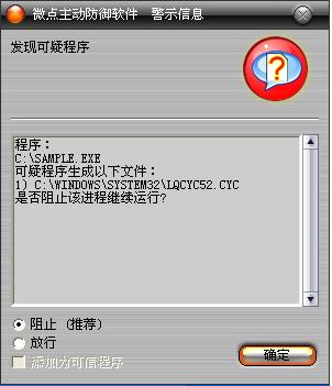 已安装使用微点主动防御软件的用户,无须任何设置,微点主动防御将自动保护您的系统免受该病毒的入侵和破坏。无论您是否已经升级到最新版本,微点主动防御都能够有效清除该病毒。如果您没有将微点主动防御软件升级到最新版,微点主动防御软件在发现该病毒后将报警提示您发现“可疑程序”,请直接选择删除处理(如图1)