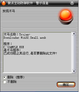 如果您已经将微点主动防御软件升级到最新版本,微点将报警提示您发现木马"Trajon-Downloader.Win32.Small.aeub”,请直接选择删除(如图2)。