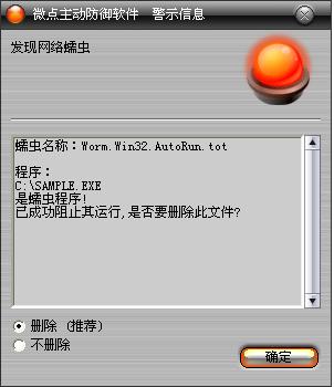 如果您已经将微点主动防御软件升级到最新版本,微点将报警提示您发现木马"Worm.Win32.AutoRun.tot”,请直接选择删除(如图2)。