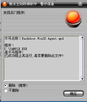 如果您已经将微点主动防御软件升级到最新版本,微点将报警提示您发现木马"Backdoor.Win32.Agent.qmd”,请直接选择删除(如图2)。