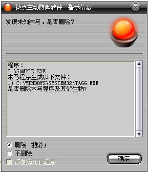 已安装使用微点主动防御软件的用户,无须任何设置,微点主动防御将自动保护您的系统免受该病毒的入侵和破坏。无论您是否已经升级到最新版本,微点主动防御都能够有效清除该病毒。如果您没有将微点主动防御软件升级到最新版,微点主动防御软件在发现该病毒后将报警提示您发现“未知木马”,请直接选择删除处理(如图1)