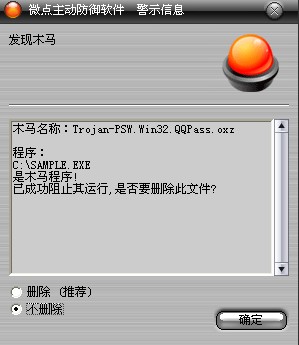 如果您已经将微点主动防御软件升级到最新版本,微点将报警提示您发现木马"Trojan-PSW.Win32.QQPass.oxz”,请直接选择删除(如图2)。