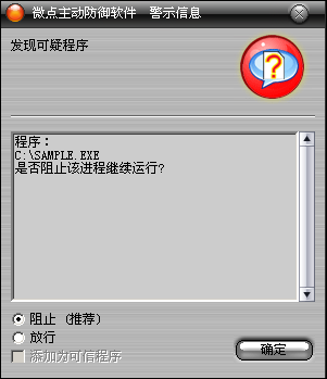 已安装使用微点主动防御软件的用户,无须任何设置,微点主动防御将自动保护您的系统免受该病毒的入侵和破坏。无论您是否已经升级到最新版本,微点主动防御都能够有效清除该病毒。如果您没有将微点主动防御软件升级到最新版,微点主动防御软件在发现该病毒后将报警提示您发现“可疑程序”,请直接选择删除处理(如图1)