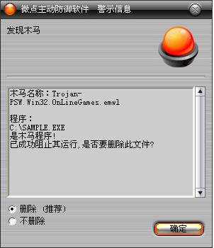 如果您已经将微点主动防御软件升级到最新版本,微点将报警提示您发现木马"Trojan-PSW.Win32.OnLineGames.emwl”,请直接选择删除(如图2)。