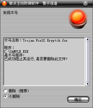 如果您已经将微点主动防御软件升级到最新版本,微点将报警提示您发现木马"Trojan.Win32.Kryptik.fzx”,请直接选择删除(如图2)。