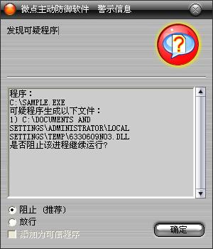 已安装使用微点主动防御软件的用户,无须任何设置,微点主动防御将自动保护您的系统免受该病毒的入侵和破坏。无论您是否已经升级到最新版本,微点主动防御都能够有效清除该病毒。如果您没有将微点主动防御软件升级到最新版,微点主动防御软件在发现该病毒后将报警提示您发现“可疑程序”,请直接选择删除处理(如图1)