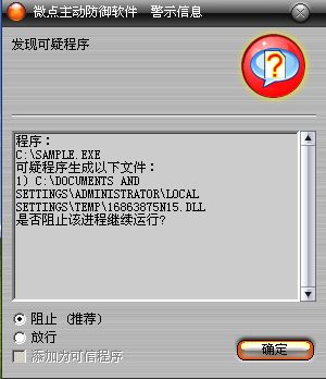 图1 微点主动防御软件自动捕获未知病毒(未升级)