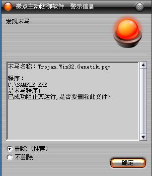 如果您已经将微点主动防御软件升级到最新版本,微点将报警提示您发现木马"Trojan.Win32.Genetik.pqm”,请直接选择删除(如图2)。