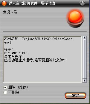 如果您已经将微点主动防御软件升级到最新版本,微点将报警提示您发现木马"Trojan-PSW.Win32.OnLineGames.emwf”,请直接选择删除(如图2)。