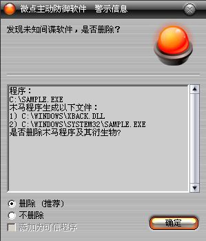 如果您已经将微点主动防御软件升级到最新版本,微点将报警提示您发现木马"Backdoor.Win32.PcClient.lgp”,请直接选择删除(如图2)。