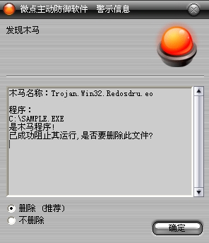 如果您已经将微点主动防御软件升级到最新版本,微点将报警提示您发现木马"Trojan.Win32.Redosdru.eo”,请直接选择删除(如图2)。