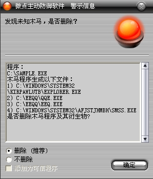 已安装使用微点主动防御软件的用户,无须任何设置,微点主动防御将自动保护您的系统免受该病毒的入侵和破坏。无论您是否已经升级到最新版本,微点主动防御都能够有效清除该病毒。如果您没有将微点主动防御软件升级到最新版,微点主动防御软件在发现该病毒后将报警提示您发现“未知木马”,请直接选择删除处理(如图1)