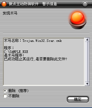 如果您已经将微点主动防御软件升级到最新版本,微点将报警提示您发现木马"Trojan.Win32.Scar.cmk”,请直接选择删除(如图2)。