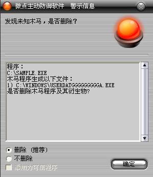 已安装使用微点主动防御软件的用户,无须任何设置,微点主动防御将自动保护您的系统免受该病毒的入侵和破坏。无论您是否已经升级到最新版本,微点主动防御都能够有效清除该病毒。如果您没有将微点主动防御软件升级到最新版,微点主动防御软件在发现该病毒后将报警提示您发现“未知木马”,请直接选择删除处理(如图1)