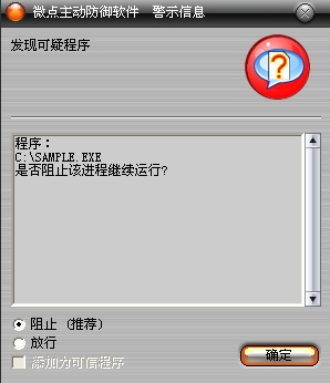 已安装使用微点主动防御软件的用户,无须任何设置,微点主动防御将自动保护您的系统免受该病毒的入侵和破坏。无论您是否已经升级到最新版本,微点主动防御都能够有效清除该病毒。如果您没有将微点主动防御软件升级到最新版,微点主动防御软件在发现该病毒后将报警提示您发现“可疑程序”,请直接选择删除处理(如图1)