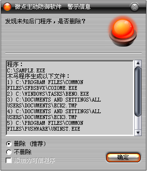 已安装使用微点主动防御软件的用户,无须任何设置,微点主动防御将自动保护您的系统免受该病毒的入侵和破坏。无论您是否已经升级到最新版本,微点主动防御都能够有效清除该病毒。如果您没有将微点主动防御软件升级到最新版,微点主动防御软件在发现该病毒后将报警提示您发现“未知后门”,请直接选择删除处理(如图1)