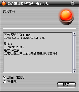 如果您已经将微点主动防御软件升级到最新版本,微点将报警提示您发现木马"Trojan-Downloader.Win32.Geral.cqb”,请直接选择删除(如图2)。