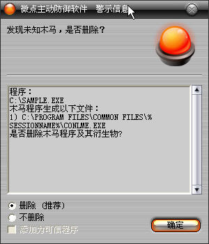 已安装使用微点主动防御软件的用户,无须任何设置,微点主动防御将自动保护您的系统免受该病毒的入侵和破坏。无论您是否已经升级到最新版本,微点主动防御都能够有效清除该病毒。如果您没有将微点主动防御软件升级到最新版,微点主动防御软件在发现该病毒后将报警提示您发现“未知木马”,请直接选择删除处理(如图1)