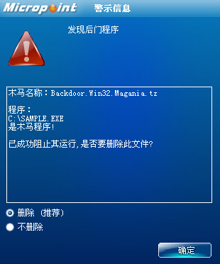 如果您已经将微点主动防御软件升级到最新版本,微点将报警提示您发现木马"Backdoor.Win32.Magania.tz”,请直接选择删除(如图2)。