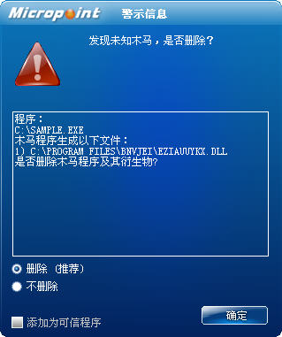 已安装使用微点主动防御软件的用户,无须任何设置,微点主动防御将自动保护您的系统免受该病毒的入侵和破坏。无论您是否已经升级到最新版本,微点主动防御都能够有效清除该病毒。如果您没有将微点主动防御软件升级到最新版,微点主动防御软件在发现该病毒后将报警提示您发现“未知木马”,请直接选择删除处理(如图1)