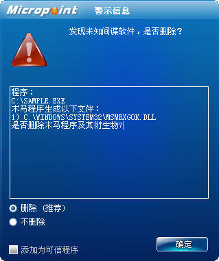 已安装使用微点主动防御软件的用户,无须任何设置,微点主动防御将自动保护您的系统免受该病毒的入侵和破坏。无论您是否已经升级到最新版本,微点主动防御都能够有效清除该病毒。如果您没有将微点主动防御软件升级到最新版,微点主动防御软件在发现该病毒后将报警提示您发现“未知间谍”,请直接选择删除处理(如图1)