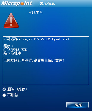 如果您已经将微点主动防御软件升级到最新版本,微点将报警提示您发现木马"Trojan-PSW.Win32.Agent.afrt”,请直接选择删除(如图2)。