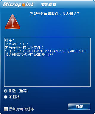 已安装使用微点主动防御软件的用户,无须任何设置,微点主动防御将自动保护您的系统免受该病毒的入侵和破坏。无论您是否已经升级到最新版本,微点主动防御都能够有效清除该病毒。如果您没有将微点主动防御软件升级到最新版,微点主动防御软件在发现该病毒后将报警提示您发现“未知间谍”,请直接选择删除处理(如图1)