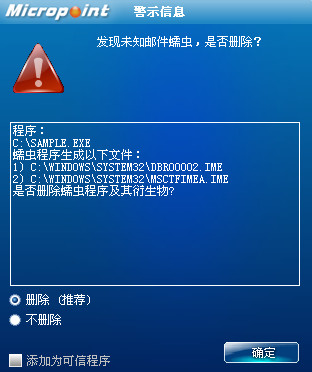 已安装使用微点主动防御软件的用户,无须任何设置,微点主动防御将自动保护您的系统免受该病毒的入侵和破坏。无论您是否已经升级到最新版本,微点主动防御都能够有效清除该病毒。如果您没有将微点主动防御软件升级到最新版,微点主动防御软件在发现该病毒后将报警提示您发现“未知邮件蠕虫”,请直接选择删除处理(如图1)