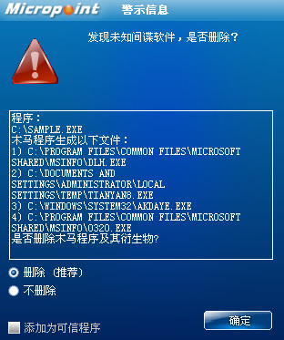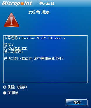 如果您已经将微点主动防御软件升级到最新版本,微点将报警提示您发现木马"Backdoor.Win32.PcClient.a”,请直接选择删除(如图2)。