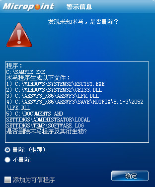 已安装使用微点主动防御软件的用户,无须任何设置,微点主动防御将自动保护您的系统免受该病毒的入侵和破坏。无论您是否已经升级到最新版本,微点主动防御都能够有效清除该病毒。如果您没有将微点主动防御软件升级到最新版,微点主动防御软件在发现该病毒后将报警提示您发现“未知木马”,请直接选择删除处理(如图1)