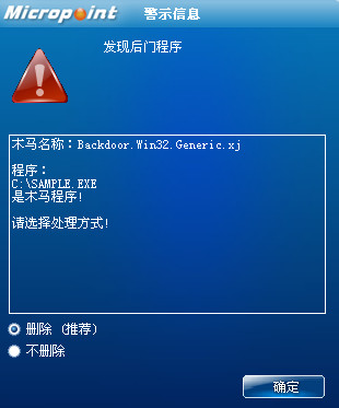 如果您已经将微点主动防御软件升级到最新版本,微点将报警提示您发现后门程序"Backdoor.Win32.Generic.xj”,请直接选择删除(如图2)。