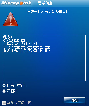 已安装使用微点主动防御软件的用户,无须任何设置,微点主动防御将自动保护您的系统免受该病毒的入侵和破坏。无论您是否已经升级到最新版本,微点主动防御都能够有效清除该病毒。如果您没有将微点主动防御软件升级到最新版,微点主动防御软件在发现该病毒后将报警提示您发现“未知木马”,请直接选择删除处理(如图1)