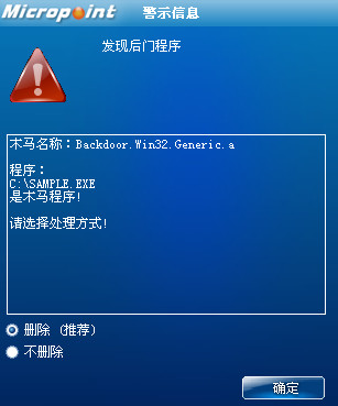 如果您已经将微点主动防御软件升级到最新版本,微点将报警提示您发现后门程序"Backdoor.Win32.Generic.a”,请直接选择删除(如图2)。