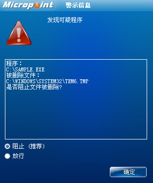 已安装使用微点主动防御软件的用户,无须任何设置,微点主动防御将自动保护您的系统免受该病毒的入侵和破坏。无论您是否已经升级到最新版本,微点主动防御都能够有效清除该病毒。如果您没有将微点主动防御软件升级到最新版,微点主动防御软件在发现该病毒后将报警提示您“发现可疑程序”,请直接选择阻止处理(如图1)
