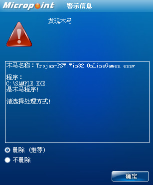 如果您已经将微点主动防御软件升级到最新版本,微点将报警提示您发现木马"Trojan-PSW.Win32.OnLineGames.essw”,请直接选择删除(如图2)