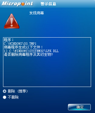 已安装使用微点主动防御软件的用户,无须任何设置,微点主动防御将自动保护您的系统免受该病毒的入侵和破坏。无论您是否已经升级到最新版本,微点主动防御都能够有效清除该病毒。如果您没有将微点主动防御软件升级到最新版,微点主动防御软件在发现该病毒后将报警提示您发现“发现病毒”,请直接选择删除处理(如图1)