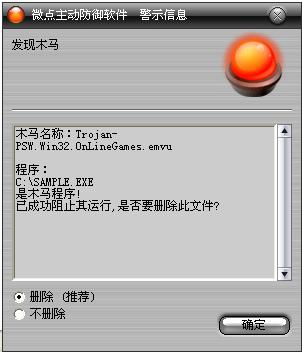 如果您已经将微点主动防御软件升级到最新版本,微点将报警提示您发现木马"Trojan-PSW.Win32.OnLineGames.emvu”,请直接选择删除(如图2)。